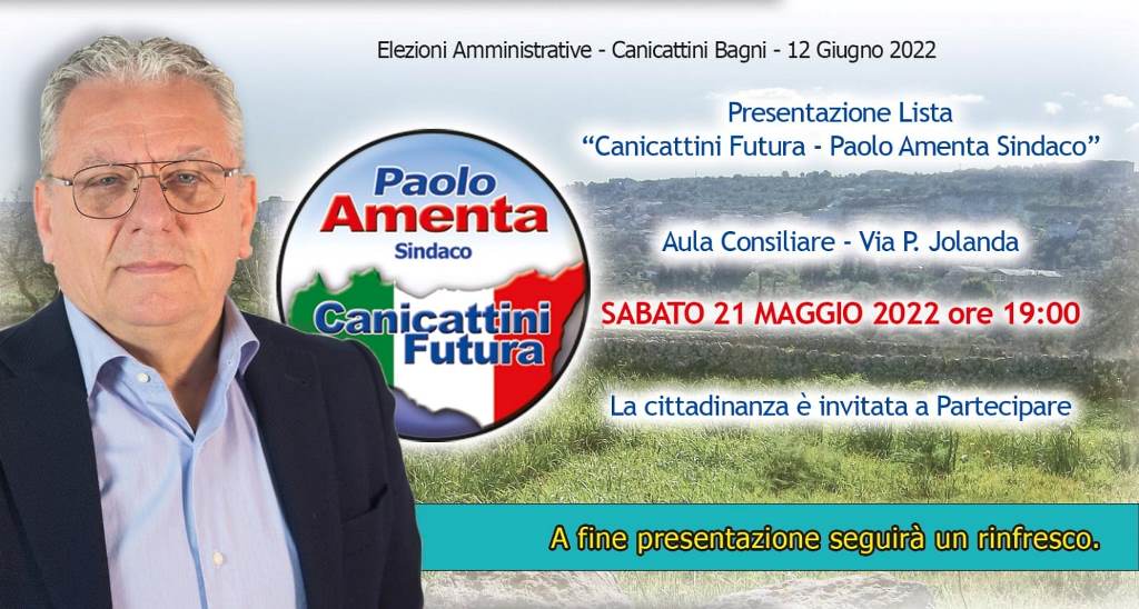 La candidatura di Paolo Amenta e la lista civica “Canicattini Futura Paolo Amenta Sindaco” verranno ufficialmente presentate alla città sabato 21 maggio 2022 alle ore 19:000 nell’aula consiliare del Comune.