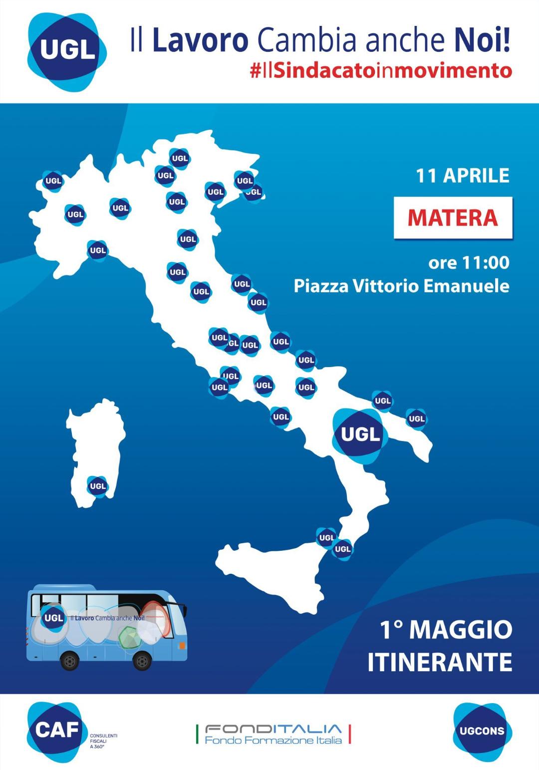 Domenica 11 aprile arriva a Matera, alle ore 11.00, in Piazza Vittorio Emanuele, la quinta tappa del tour itinerante promosso dall’UGL, a bordo di un bus, in occasione della Festa del Lavoro col motto “Il Lavoro Cambia anche Noi!”. Il sindacato ha deciso di essere al fianco dei lavoratori con 30 appuntamenti che si snoderanno lungo l’Italia e che si concluderanno sabato primo maggio a Milano.