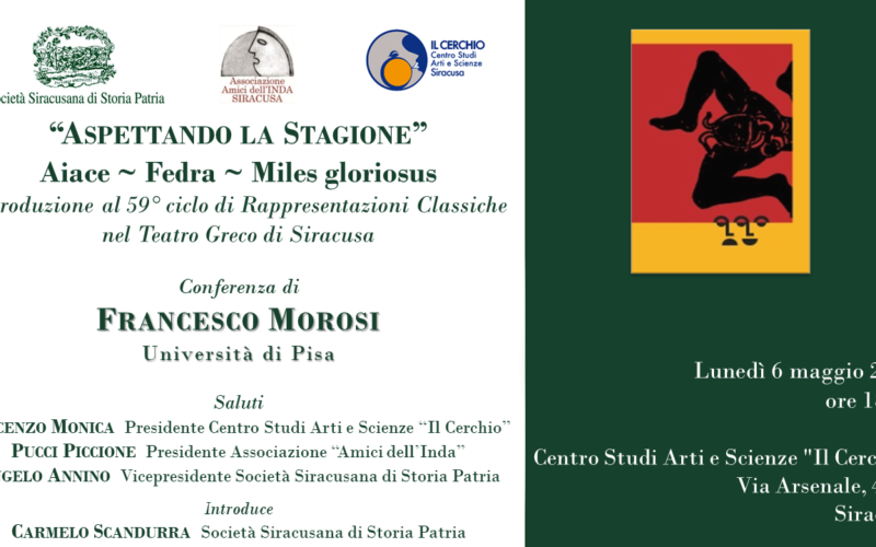 In vista dell’inizio del 59° ciclo di spettacoli classici al Teatro Greco di Siracusa, che prenderanno il via la prossima settimana, come da tradizione la Società Siracusana di Storia Patria, insieme con il Centro Studi Arti e Scienze “Il Cerchio” e l’Associazione “Amici dell’INDA”, organizzano una conferenza di presentazione dal titolo “Aspettando la Stagione: Aiace, Fedra, Miles gloriosus” che si terrà lunedì 6 maggio alle ore 18:30 nella sede de “Il Cerchio” in via Arsenale 40/b, a Siracusa.