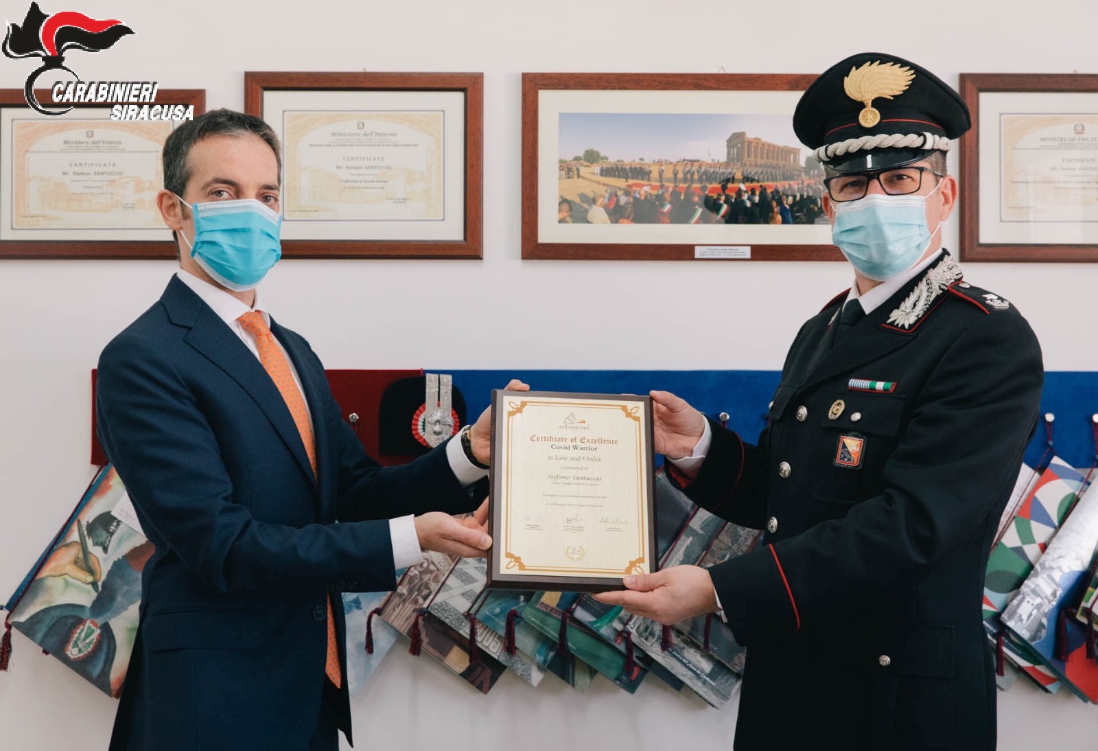 Ieri, nel suo ufficio presso la caserma dei Carabinieri di via Aldo Moro 7 ad Augusta, ovviamente nel rispetto delle misure di contenimento del virus, il Maggiore Santuccio ha ricevuto dalle mani dell’Avvocato Stefano Pipitone, rappresentante e coordinatore della ONLUS, la targa a lui indirizzata.