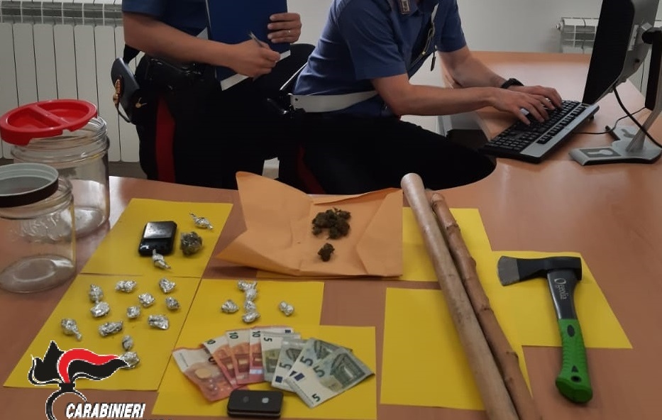 I militari hanno fermato il soggetto nel corso di un servizio di controllo alla circolazione stradale e, conoscendone i precedenti, hanno deciso di procedere con una perquisizione personale e veicolare. Il sospetto si è rivelato corretto, poiché poco dopo, celate all’interno degli slip indossati dall’uomo, i Carabinieri hanno rinvenuto 6 dosi di marijuana del peso di 6 grammi circa e, all’interno del portabagagli dell’autovettura, due bastoni in legno della lunghezza di circa 70 centimetri ed un’ascia.