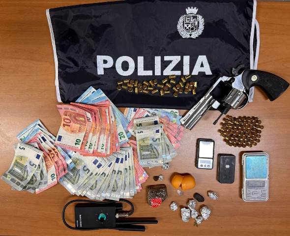 Pertanto, i Poliziotti accedevano all’interno dell’immobile e sequestravano 0,50 grammi di eroina, 44 grammi di hashish, 5 grammi di marijuana, tre bilancini di precisione, la somma 745 euro, una pistola a tamburo a salve, priva di tappo rosso cal. 38, 96 cartucce a salve calibro 38 e un rilevatore di presenza di microspie e di GPS perfettamente funzionante.