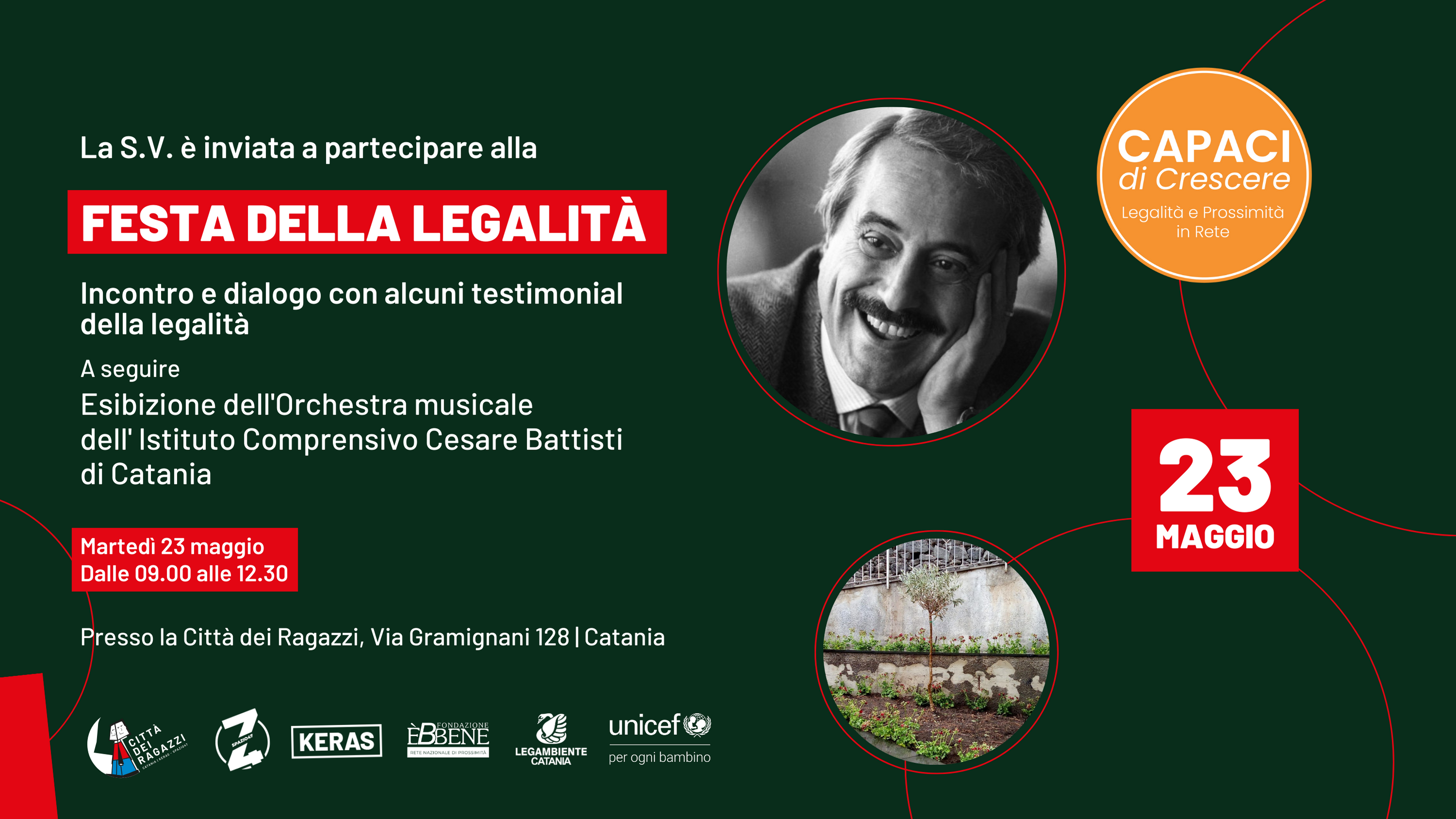 Una targhetta sarà affissa dell’albero di ulivo donato da Legambiente alla quartiere Angeli Custodi come simbolo di riqualificazione e pace “che le cose siano cosi, non vuol dire che debbano andare cosi. Solo che quando si tratta di rimboccarsi le maniche ed incominciare a cambiare, vi è un prezzo da pagare. Ed è allora che la più grande maggioranza preferisce lamentarsi piuttosto che fare” – Giovanni Falcone-.