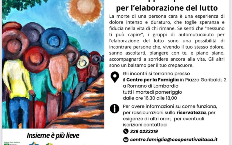 Il dolore per la perdita di una persona cara può essere un cammino difficile e solitario. Per questo, l’Ambito dei Servizi Sociali del nostro Comune, attraverso l’azienda speciale consortile Solidalia, organizza un Gruppo di Parola per l’elaborazione del lutto.