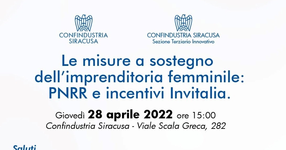Siracusa, 26 aprile 2022 – Su iniziativa della Sezione Terziario Innovativo di Confindustria Siracusa, in collaborazione con il gruppo tecnico credito e finanza, si terrà giovedì 28 aprile con inizio alle ore 15,00, nella sala “Ugo Gianformaggio” di Confindustria Siracusa, il seminario “Le misure a sostegno dell’imprenditoria femminile: PNRR e incentivi Invitalia” con lo scopo di illustrare i principali strumenti previsti dal PNRR per sostenere e incentivare l’imprenditoria femminile.