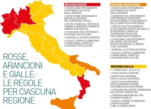 - I bar e ristoranti saranno aperti fino alle 18 nella zona gialla, chiusura 7 giorni su 7 nelle zone arancione e rossa. L’asporto è consentito fino alle ore 22. – gli asili e la scuola elementare saranno aperti ovunque. Le medie saranno in presenza solo nelle zone gialla e arancione. Nelle zone rosse anche la seconda e la terza media avranno la didattica a distanza.