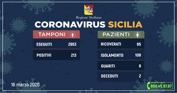 16 marzo 2020-Questo il quadro riepilogativo della situazione nell’Isola, aggiornato alle ore 12 di oggi (lunedì 16 marzo), in merito all’emergenza Coronavirus, così come comunicato dalla Regione Siciliana all’Unità di crisi nazionale.