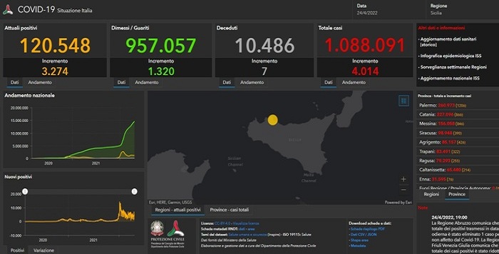 La Sicilia è oggi al settimo posto per contagi. Gli attuali positivi sono 120.548 con un aumento di 3.274 casi. I guariti sono 1.320 mentre le vittime sono 7 portano il totale dei decessi a 10.486.