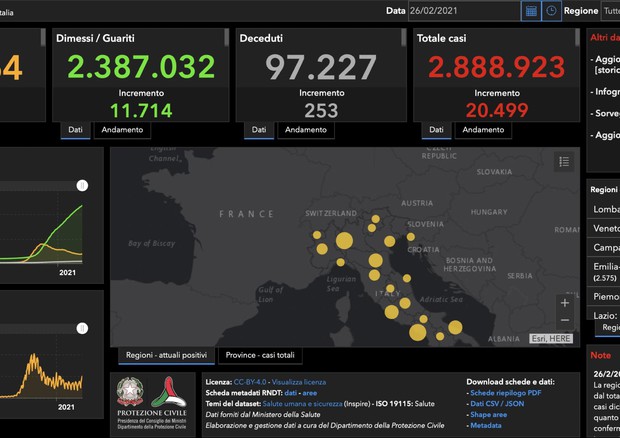 La Regione con più casi è sempre la Lombardia (+4.557), seguita da Emilia Romagna (+2.575), Campania (+2.519), Lazio (+1.539) e Piemonte (+1.526). Il totale dei casi sale a 2.888.923.
