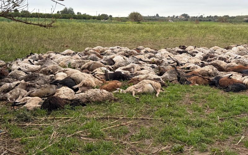 Decine di carcasse di pecore sono ammassate in un terreno agricolo nella zona della Fonte Ciane. Il gregge sarebbe stato decimato dal passaggio del ciclone Harry e a distanza di quasi dieci giorni, le carcasse degli ovini giacciono a pochi passi dal fiume Anapo, che in almeno due argini è esondato, allagando i campi vicini.