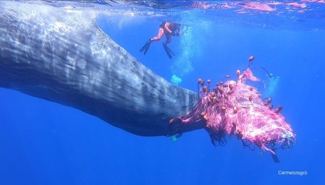 Un altro capodoglio è rimasto impigliato in una rete da pesca illegale al largo di Salina, nell’arcipelago delle Eolie. L’avvistamento è stato fatto da alcuni diportisti che hanno dato l’allarme. Nella rete è rimasta impigliata la coda del cetaceo di oltre 10 metri. Da ieri mattina sono all’opera l’equipaggio di una motovedetta della guardia costiera, i biologi Monica Blasi e Carmelo Isgrò e alcuni volontari che hanno tentato senza fortuna di liberarlo.