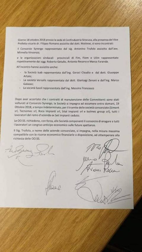 Il contratto era stato stipulato in sede di Confindustria tra i segretari sindacali di categoria, alla presenza del vice prefetto vicario, Filippo Romano. In quella sede, il consorzio Synergo si era impegnato, davanti ai rappresentanti delle committenti Isab, Versalis e Sasol ad assumere i lavoratori già nella giornata del 19 ottobre. Ma ad oggi quel contratto è rimasto solo lettera morta