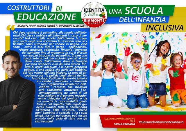 Creare uno spazio interno ad uso esclusivo per gli alunni della scuola dell’infanzia, dove le famiglie possano prendersi cura dei loro piccoli, fornito di arredi adeguati, è la nostra proposta politica.