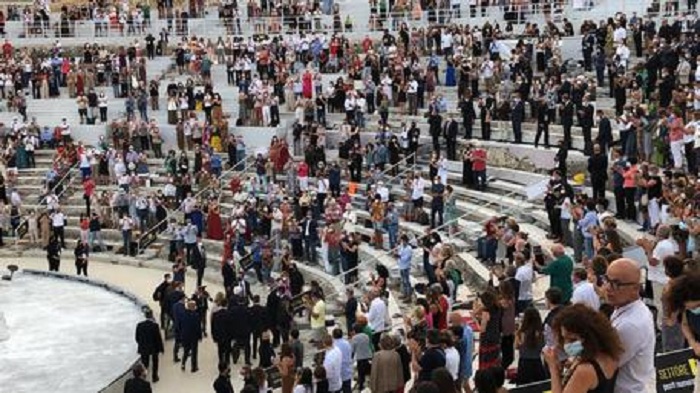 Il presidente Mattarella è poi stato accolto in teatro dal lungo applauso del pubblico del Teatro Greco di Siracusa.