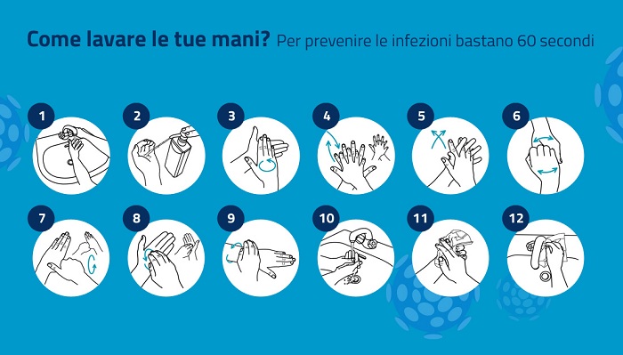 Resta a casa e segui i consigli utili a prevenire il contagio da coronavirus. Cura l’igiene delle mani con acqua e sapone o con un gel a base alcolica. Bastano tra i 40 e 60 secondi e questi semplici movimenti: