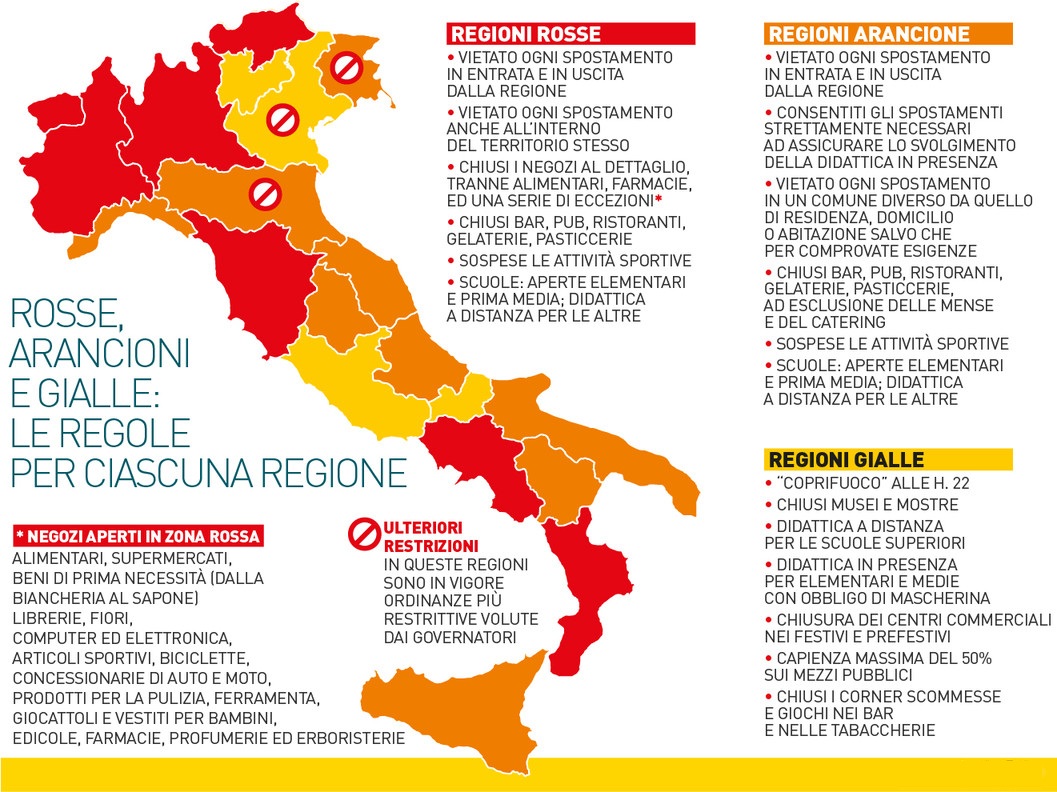 Per le regioni nelle zone arancioni e rosse, dove si parla rispettivamente di rischio moderato e di grave criticità, si applicano ordinanze ad hoc del ministero della salute. In quella arancione sono previste tutte le limitazioni delle zona gialla, con interventi lievemente meno restrittivi rispetto alla zona rossa. Questa è la più rigida dove chiudono tutti i negozi ad eccezione di librerie, fiori, computer ed elettronica, articoli sportivi, biciclette, concessionarie di auto e moto, i negozi che vendono prodotti per la pulizia, i ferramenta, i negozi di giocattoli e vestiti per bambini, le edicole, le farmacie, le profumerie e le erboristerie.