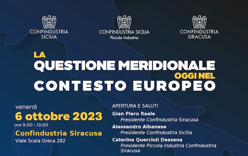 Siracusa, 29 settembre 2023 – “La questione meridionale oggi nel contesto europeo” il tema che verrà trattato venerdì 6 ottobre con inizio alle ore 9,00 nel corso del convegno organizzato nella sede di Confindustria Siracusa dalla Piccola Industria di Sicilia guidata da Sebastiano Bongiovanni.
