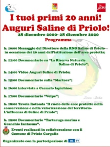 Così, in occasione dell’anniversario, non potendo procedere a manifestazioni pubbliche, la ricorrenza si svolgera tramite dirette e video nella pagina Facebook Riserva Saline di Priolo. Primo appuntamento alle ore 10:00. Durante i vari interventi si farà una disamina dell’attività svolta in questi primi 20 anni. Mentre l’8 gennaio 2021, presso la sede del Consiglio comunale di Priolo Gargallo, si affronteranno i progetti futuri.