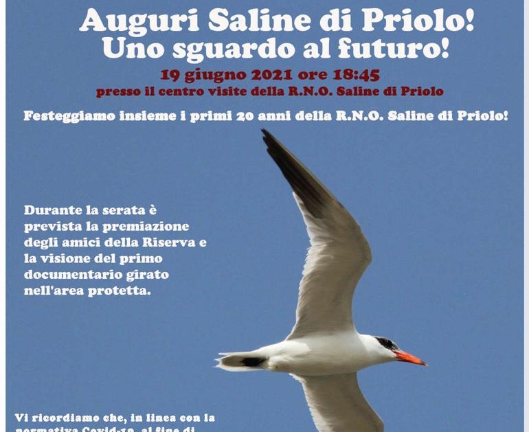 Auguri Saline di Priolo! Uno sguardo al futuro!”. Sabato 19 giugno, a partire dalle 18.45, presso il centro visite della Riserva Naturale Orientata Saline, si terrà una manifestazione per festeggiare i 20 anni della Riserva, organizzata dal Comune di Priolo e dalla LIPU.
