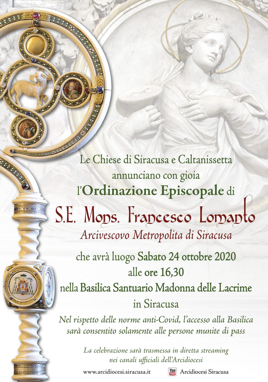 Le Chiese di Siracusa e Caltanissetta annunciano con gioia l’Ordinazione Episcopale di S.E. mons. Francesco Lomanto, arcivescovo metropolita di Siracusa. La celebrazione avrà luogo sabato 24 ottobre alle ore 16.30 nella Basilica Santuario Madonna delle Lacrime a Siracusa. Nel rispetto delle norme anti-covid l’accesso alla Basilica sarà consentito esclusivamente alle persone munite di pass. La celebrazione sarà trasmessa in diretta streaming sui canali dell’Arcidiocesi: sul sito www.arcidiocesi.siracusa.it; sul canale You Tube Arcidiocesi di Siracusa e sulla pagina Facebook Arcidiocesi di Siracusa.