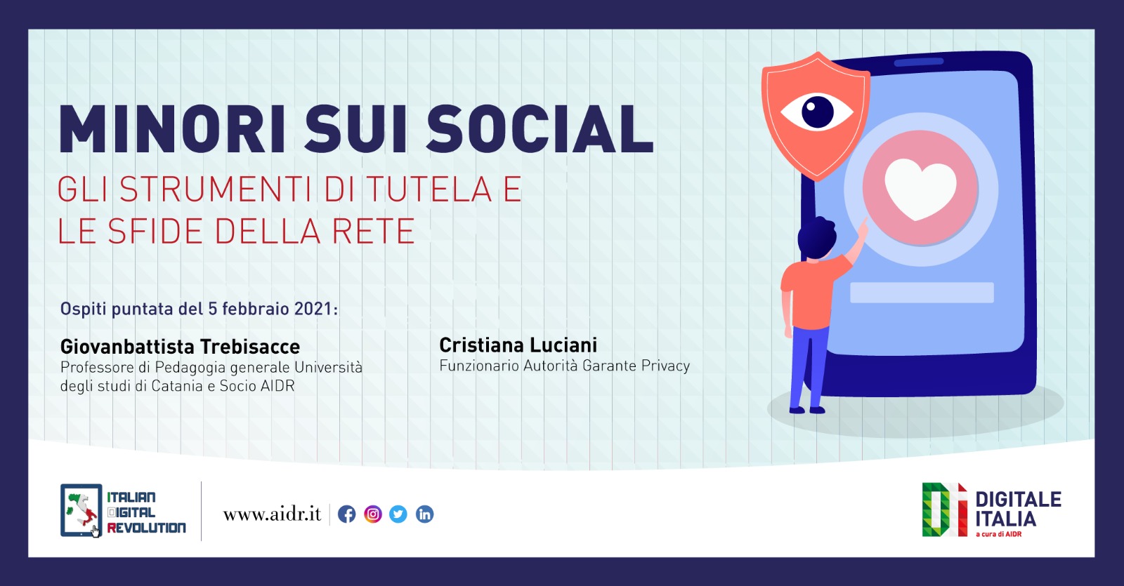 Come tutelare i nostri ragazzi, quali sono le insidie della rete, come garantire un uso sicuro dei social network. A Digitale Italia nuovo approfondimento dedicato ai temi della digitalizzazione, alla luce dei drammatici fatti di Palermo. Ospiti del format web di Aidr: Cristiana Luciani, funzionario Autorità Garante dei Dati Personali e Giovanbattista Trebisacce – docente di Pedagogia Generale Università degli Studi di Catania e socio Aidr.
