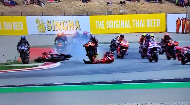 Il pilota della Ducati era partito fortissimo, ma alla prima curva si è registrata una carambola che ha coinvolto almeno cinque piloti: Bastianini, Alex Marquez, Di Giannantonio, Zarco e Bezzecchi.