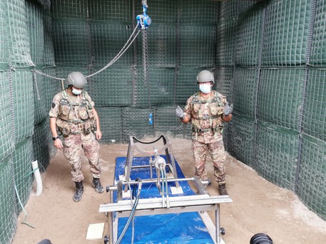 “Qui attraverso un macchinario definito swordfish – spiega il luogotenente Giuseppe Carini – sezioneremo la bomba attraverso una lancia che ‘spara’ acqua e sabbia ad alta pressione. La parte non in sicurezza verrà fatta brillare qui dentro, in sicurezza”.