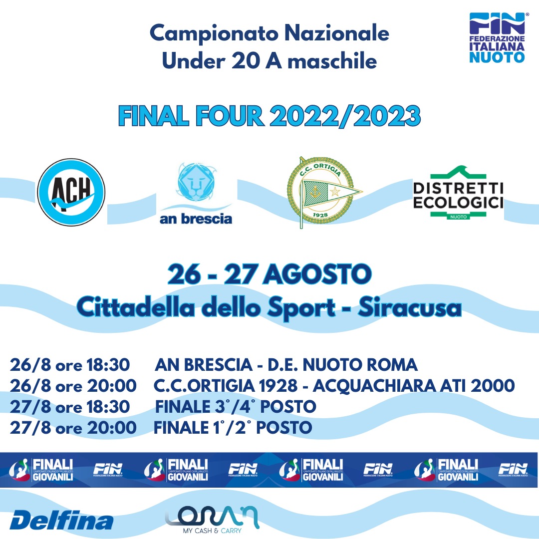 21 agosto 2023 – Per la pallanuoto maschile, la scorsa stagione, a livello giovanile, non è ancora finita, ma riserva anzi un’appendice prestigiosa che gli appassionati siracusani potranno godersi da vicino. Si avvicina, infatti, il momento decisivo per la categoria Under 20: sabato e domenica prossimi, alla piscina “Paolo Caldarella” di Siracusa, si disputerà la Final Four del campionato italiano Under 20.
