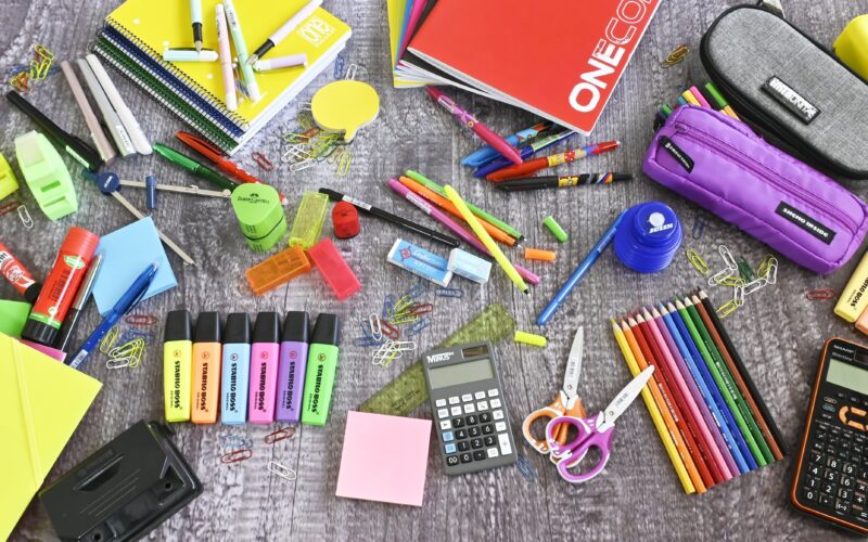– Materiali per attività scolastiche (penne, matite, zaini, diari, pennarelli, pastelli, quaderni, fogli ecc.).