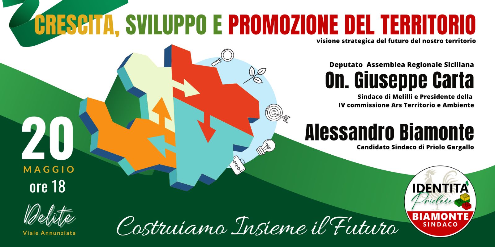 Priolo Gargallo, 19 maggio 2023 – Sabato 20 maggio alle ore 18, al locale “Delite” in viale Annunziata, si terrà un incontro molto importante, dal titolo “Crescita, sviluppo e promozione del territorio”. Insieme al candidato sindaco di Priolo Gargallo per la lista “Identità Priolese”, Alessandro Biamonte, sarà presente l’On. Peppe Carta, sindaco di Melilli e presidente della IV commissione Ars Territorio e Ambiente.