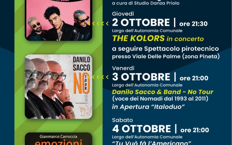 L’apertura è affidata questa sera, alle ore 21:00, allo spettacolo di danza “Tra Linee e Corpi, Istanti Coreografici” a cura di Studio Danza Priolo. Domani, giovedì 2 ottobre, sarà la volta dell’evento più atteso: alle 21:30 saliranno sul palco i The Kolors, il gruppo pop-rock-funk vincitore della 14ª edizione di Amici, diventato fenomeno musicale con brani come Everytime, Italodisco, Un ragazzo, una ragazza e Pensare male. A chiudere la serata, i fuochi d’artificio in via delle Palme.