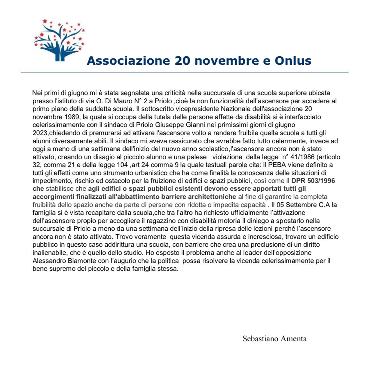 L’ascensore è guasto e la scuola non può ricevere l’iscrizione di un alunno disabile. La vicenda è accaduta all’istituto superiore Ruiz dove, nel plesso di via Di Mauro, manca la funzionalità dell’ascensore. La riparazione dell’elevatore era stata richiesta a giugno ma ancora oggi, nonostante le rassicurazioni da parte del Comune priolese, l’ascensore non è funzionale. La questione emerge da una nota dell’Associazione XX novembre, per la tutela delle persone affette da disabilità, che ha lamentato la mancata iscrizione dell’alunno. “Il sindaco – dice Sebastiano Amenta, vice presidente dell’associazione – mi aveva rassicurato che avrebbe fatto tutto celermente, invece ad oggi a meno di una settimana dell’inizio del nuovo anno scolastico, l’ascensore ancora non è stato attivato, provocando disagio al piccolo alunno. Questa è una violazione della legge n° 41/1986. Trovo assurdo e increscioso che in un edificio pubblico, in questo caso addirittura una scuola, vi siano barriere che provocano preclusione ad un diritto inalienabile, che è quello allo studio”.