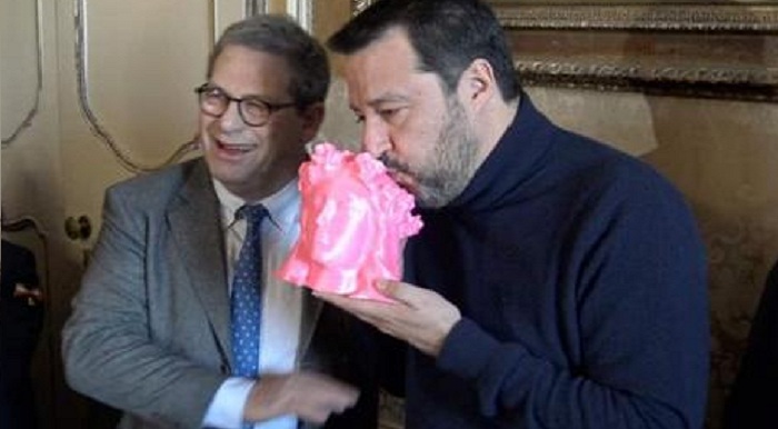 “In passato mi ha dato anche dello stronzo, ma io non porto rancore a Gianfranco Miccichè: lo ringrazio per l’accoglienza e la visita a Palazzo dei Normanni” ha detto Salvini che ha ricevuto dal presidente dell’Ars una riproduzione della testa di santa Rosalia in fibra di mais di colore rosa, mentre il direttore della Federico II gli ha regalato la copia di uno dei due leoni marmorei del XII secolo.