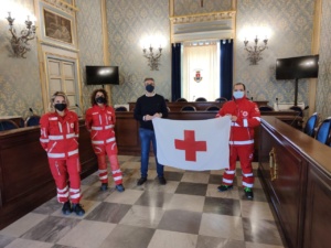 Nel corso dell’incontro è stata consegnata al primo cittadino la bandiera della Cri, che sarà esposta sul balcone del Palazzo di Città analogamente a quanto avviene in molte altre città italiane fino al 9 maggio. Per questa occasione il presidente ha chiesto e ottenuto di illuminare di rosso un monumento della città, come avviene in tutte le parti d’Italia. Oltre all’indubbio significato simbolico, l’esposizione della bandiera ha l’obiettivo di far conoscere i compiti svolti dai volontari a vantaggio della popolazione e a sostegno della loro dignità.