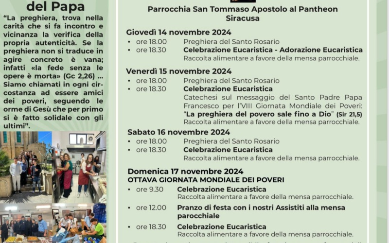 Nella parrocchia San Tommaso Apostolo al Pantheon di Siracusa oggi alle ore 18.00 preghiera del Santo Rosario, e alle ore 18.30 celebrazione eucaristica. Al termine, raccolta alimentare a favore della mensa parrocchiale. Ieri la catechesi sul messaggio del Santo Padre per la Giornata mondiale dei poveri.