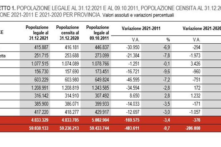 L’Istat ha reso noti i dati del censimento della popolazione relativo al 2021.