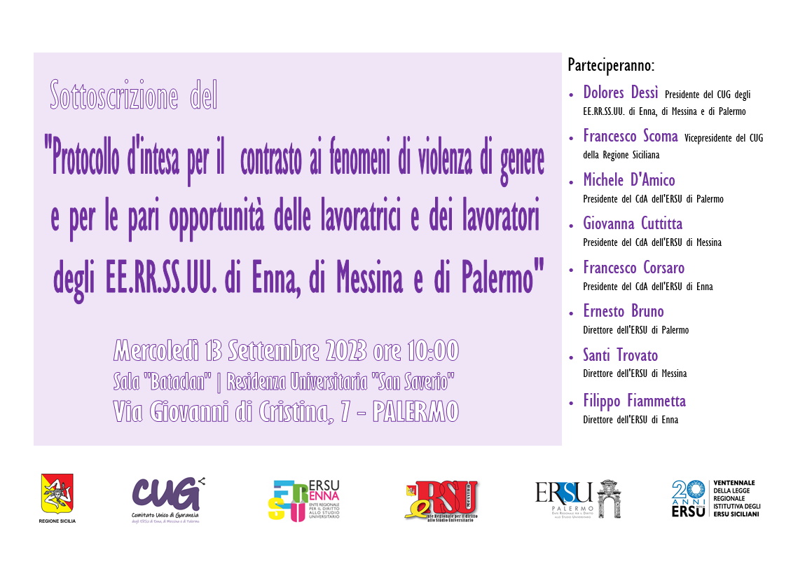 A sottoscrivere il documento contro la violenza di genere saranno: Dolores Dessì, presidente del CUG degli ERSU di Enna, di Messina e di Palermo; Francesco Scoma, vice-presidente del CUG della Regione Siciliana; Michele D’Amico, presidente ERSU Palermo; Giovanna Cuttitta, presidente ERSU Messina; Francesco Corsaro, presidente ERSU Enna; Ernesto Bruno, direttore ERSU Palermo; Santi Trovato, direttore ERSU Messina; Filippo Fiammetta, direttore ERSU Enna.