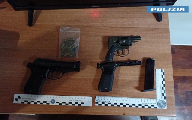 In particolare, a seguito di una perquisizione domiciliare, effettuata a casa dell’arrestato, i poliziotti hanno rinvenuto e sequestrato un revolver privo di marca e di matricola, rifornito con cinque cartucce, una pistola artigianale del tipo a penna ed una pistola a salve semiautomatica.