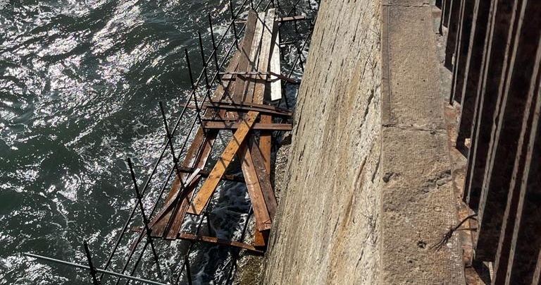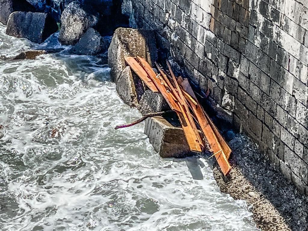 Il ponteggio montato e usato per la riparazione della breccia esistente sul muraglione di levante in Ortigia non è stato messo in sicurezza come la normativa impone e, omettendo ogni regola di buon senso e di rispetto, nonostante la previsione meteo fosse chiarissima riguardo l’arrivo della prima depressione estiva, non si è corso ai ripari. Adesso le “tavole da carpenteria” di una lunghezza intorno ai 4 metri di lunghezza fanno da cornice alla costa est siracusana per un tratto di mare lungo, molto lungo: dal monumento ai caduti sino a dentro il porto grande.