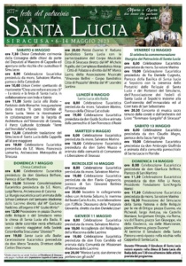 Alle ore 12,00 traslazione del Simulacro di Santa Lucia dalla Cappella all’altare maggiore. Domani sera alle ore 19,00 celebrazione eucaristica presieduta da mons. Francesco Lomanto, Arcivescovo di Siracusa.
