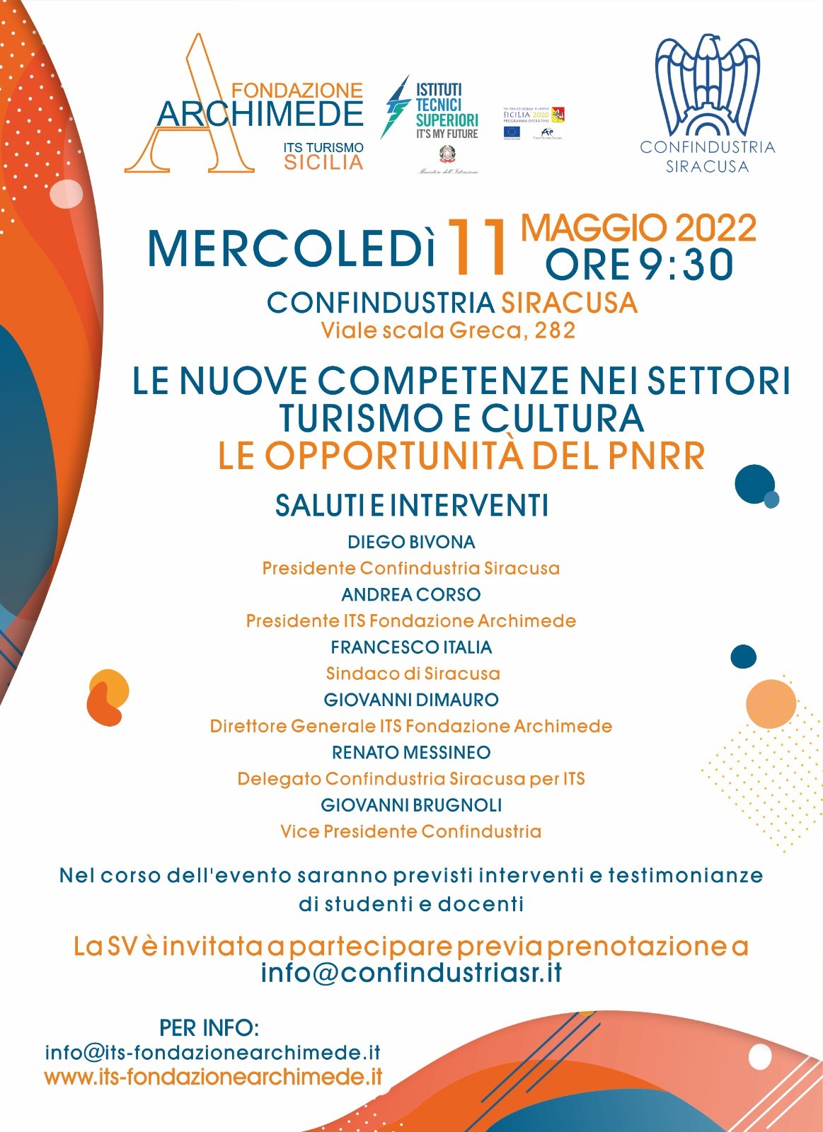 Dopo i saluti del Presidente di Confindustria Siracusa Diego Bivona e del Presidente della Fondazione ITS Archimede, Andrea Corso, interverrà il Sindaco di Siracusa Francesco Italia.