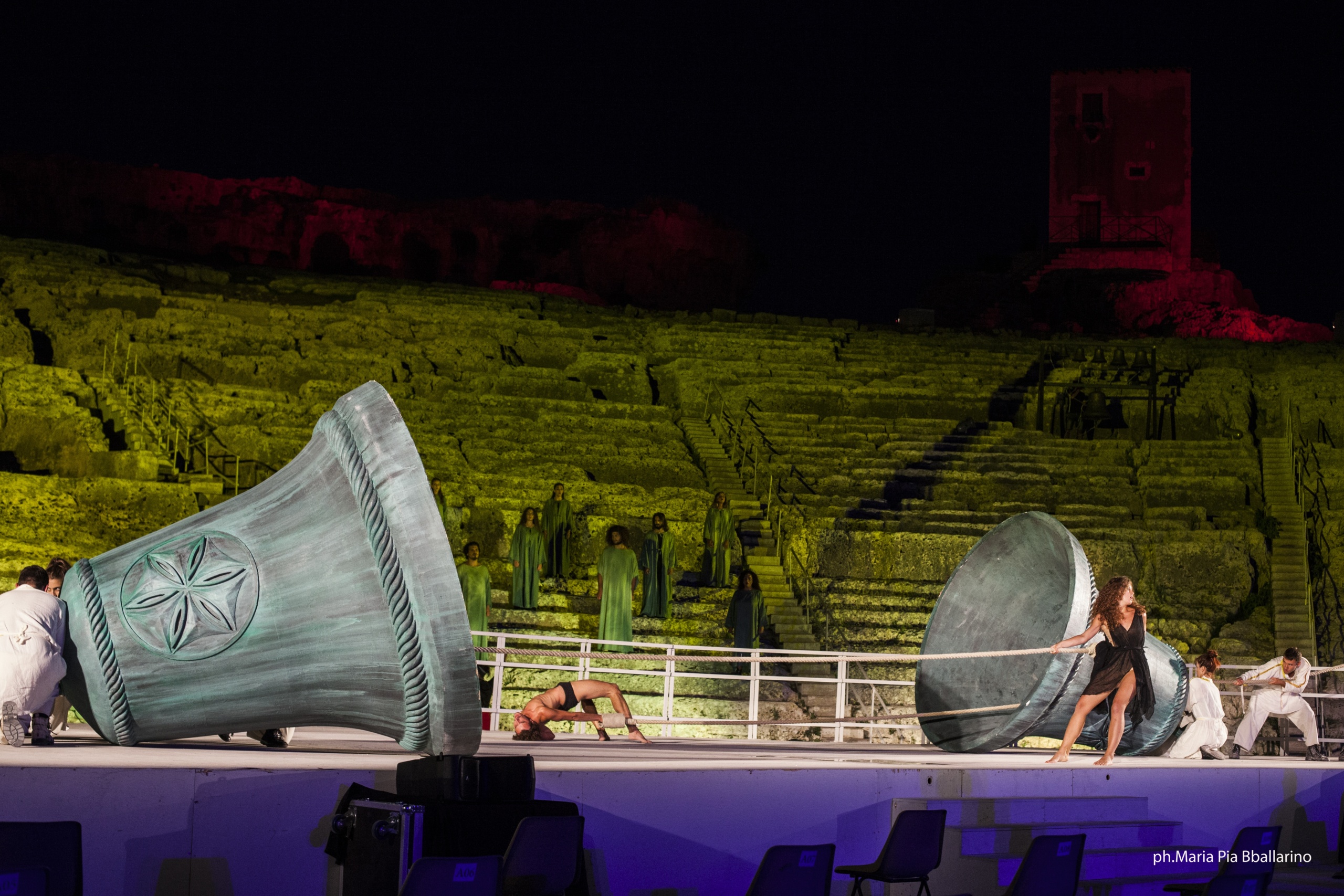 Il suono del mio corpo è la memoria della mia presenza ha coinvolto gli allievi e i docenti dell’Accademia d’arte del dramma antico, Dario La Ferla ha firmato i movimenti di scena, Simonetta Cartia e Elena Polic Greco la direzione del coro, Simone Caserta le musiche, alle campane Denis Latîșev.