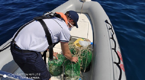 Inoltre, sempre nell’ambito della succitata attività di controllo della filiera ittica, il personale imbarcato a bordo del gommone G.C. B31 ha intercettato, nello specchio acqueo ricadente tra il Porto Piccolo e il Monumento ai caduti, la presenza di un campo nasse assicurato ad una bottiglia di plastica, utilizzata in maniera impropria quale segnalamento. Le nasse, non riconducibili ad alcun soggetto, venivano pertanto recuperate a bordo e sequestrate.