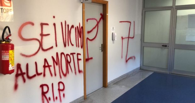 “Sei vicino alla morte R.I.P.”, una svastica e una falce a martello davanti allo studio del primario del reparto di oculistica dell’ospedale Umberto I° di Siracusa, Paolo Caruso, stimato medico. Il fatto è successo stanotte. Gli addetti del reparto intorno alla 7.00 di stamane hanno proceduto, come ogni mattina, all’apertura degli uffici, ma nel muro dello studio del primario, situato tra l’entrata principale del reparto e una vetrata divisoria con il resto del settore di oculistica, hanno trovato le mura imbrattate di vernice rossa con la minacciosa scritta. Del grave gesto è stata avvisata la polizia di Stato per le indagini del grave atto di sicura matrice intimidatoria.