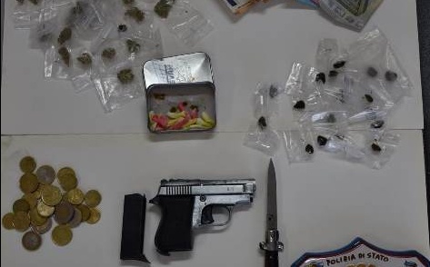In questa circostanza, il giovane è stato sorpreso in possesso di una pistola calibro 22 con matricola abrasa, un coltello a scatto e alcune dosi di hashish, cocaina e marijuana e denaro contante.