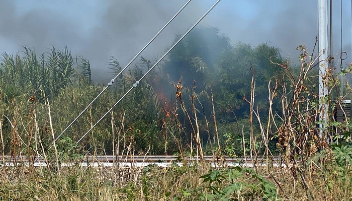Sul posto, per spegnere le fiamme che hanno coinvolto la vegetazione presente, sono intervenuti 3 mezzi della Protezione Civile, anche a salvaguardia della viabilità ferroviaria.