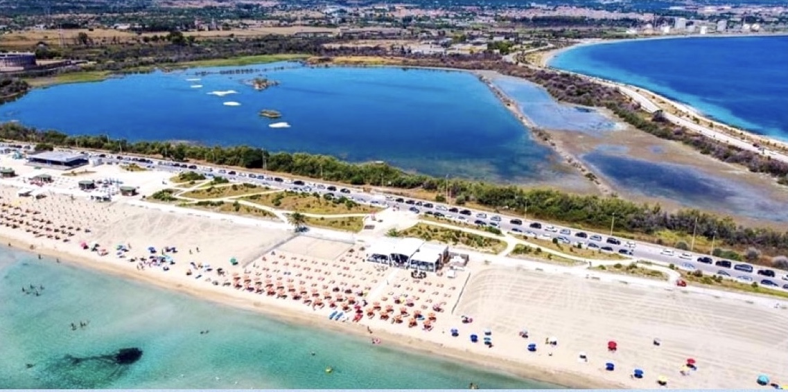 Spiaggia Marina di Priolo, una spiaggia caratterizzata da sabbia fine chiara, bagnata da un mare cangiante dal turchese all’azzurro con sfumature di indaco, cristallino e limpido, con fondale digradante dolcemente verso il largo, alle spalle la riserva naturale orientata Saline di Priolo (Lipu)