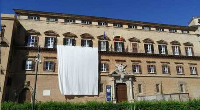 Un grande lenzuolo bianco è stato esposto sul prospetto principale di Palazzo dei Normanni per ricordare la strage di Capaci, in cui persero la vita il giudice Giovanni Falcone, la moglie Francesca Morvillo e gli agenti della scorta Antonio Montinaro, Vito Schifani e Rocco Dicillo.
