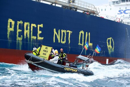 “Abbiamo scritto ‘Peace not oil’ sulla fiancata della Scf Baltica arrivata al largo di Siracusa con un carico di petrolio dalla Russia.