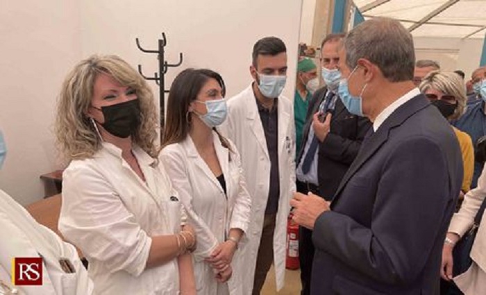Dopo l’inaugurazione del centro vaccini di Brolo, Musumeci ha fatto visita all’hub realizzato nel parcheggio Lumbi di Taormina, accolto dal sindaco Mario Bolognari e dal prefetto di Messina, Cosima Di Stani.